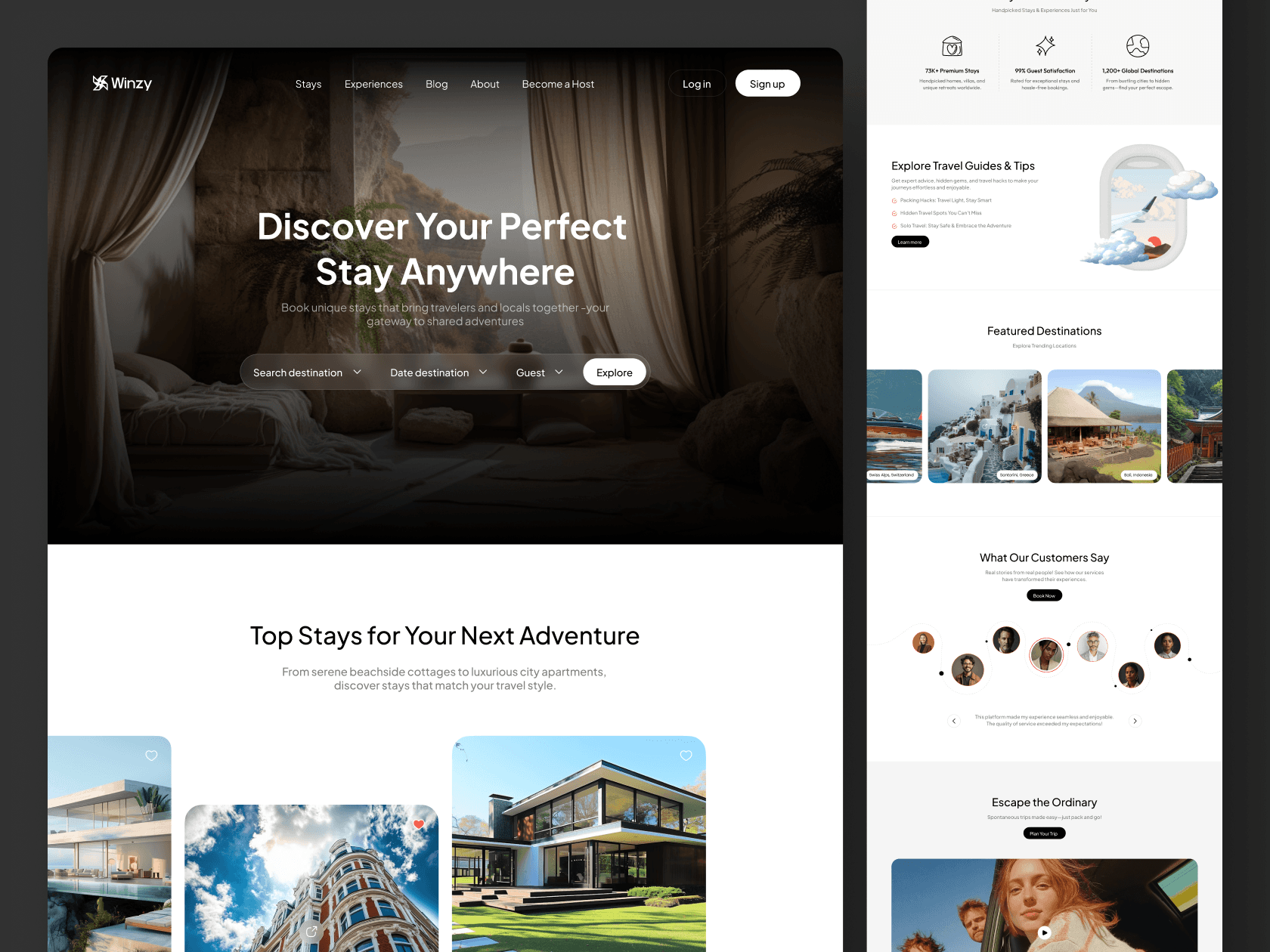 The hero experience was designed to immediately capture attention with bold destination visuals and clear search functionality. Structured stay listings, detailed property pages, and intuitive filters create a guided browsing journey. Every section from testimonials to featured destinations was optimized to build trust and drive action.